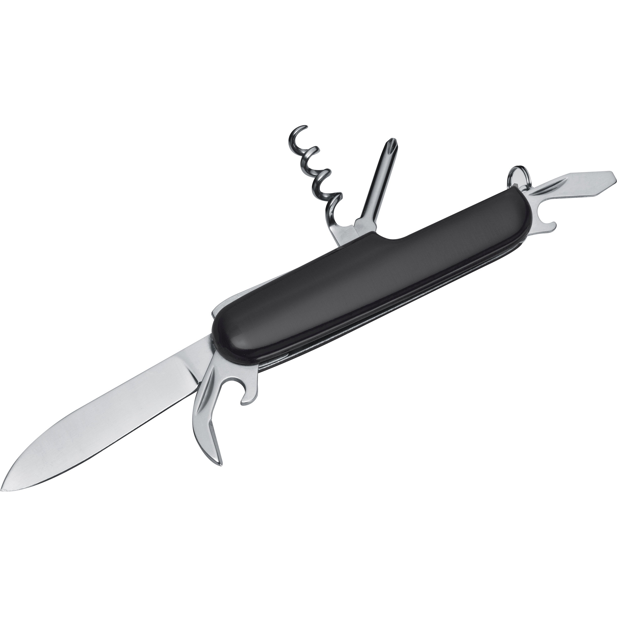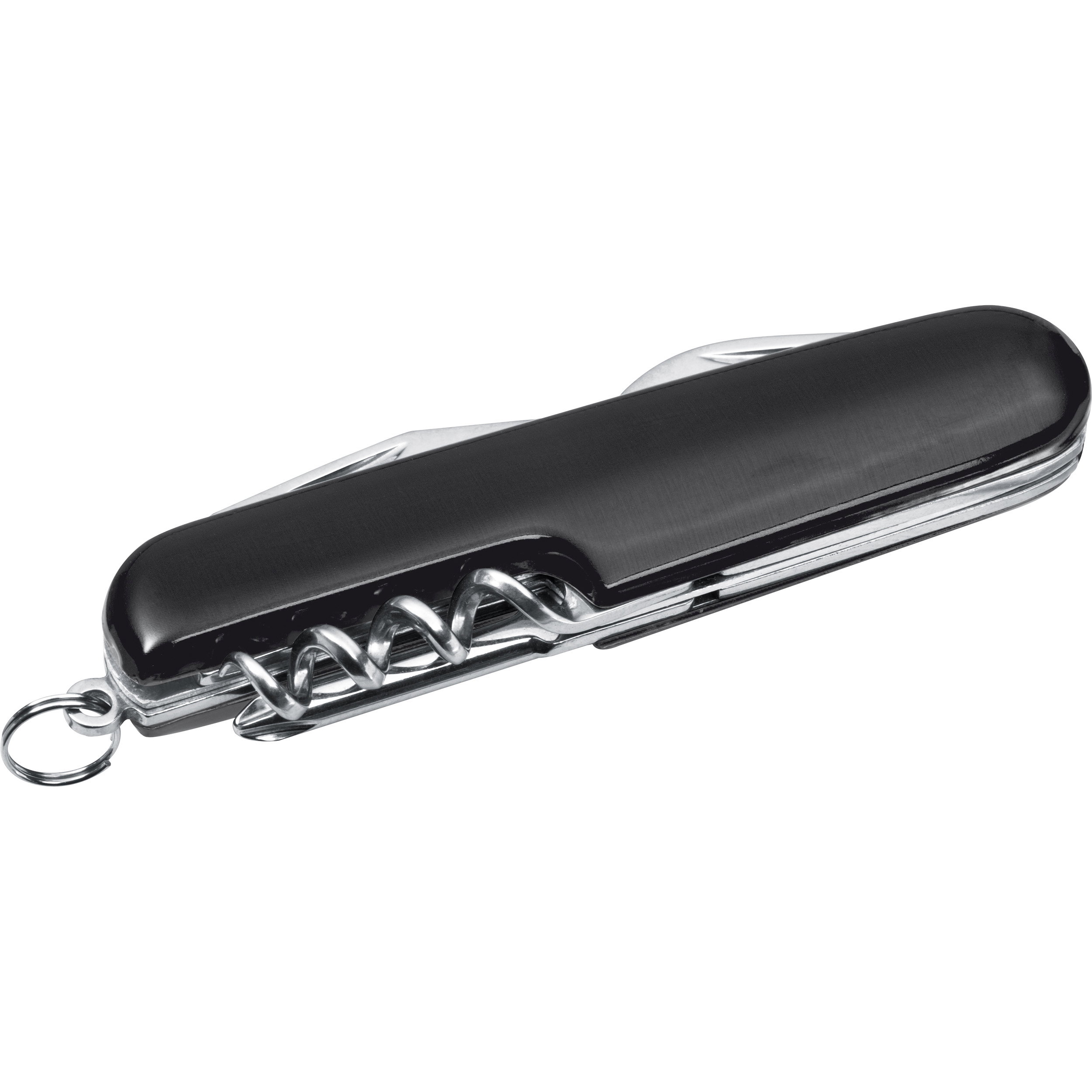 Unser edles 7-teiliges Aluminium-Taschenmesser ist ein vielseitiges Werkzeug mit einer hochwertigen Metallic-Lackierung. Es verfügt über eine große Klinge, einen Dosen- und Flaschenöffner, einen Korkenzieher, Kreuz- und Schlitzschraubendreher sowie einen praktischen Schlüsselring.