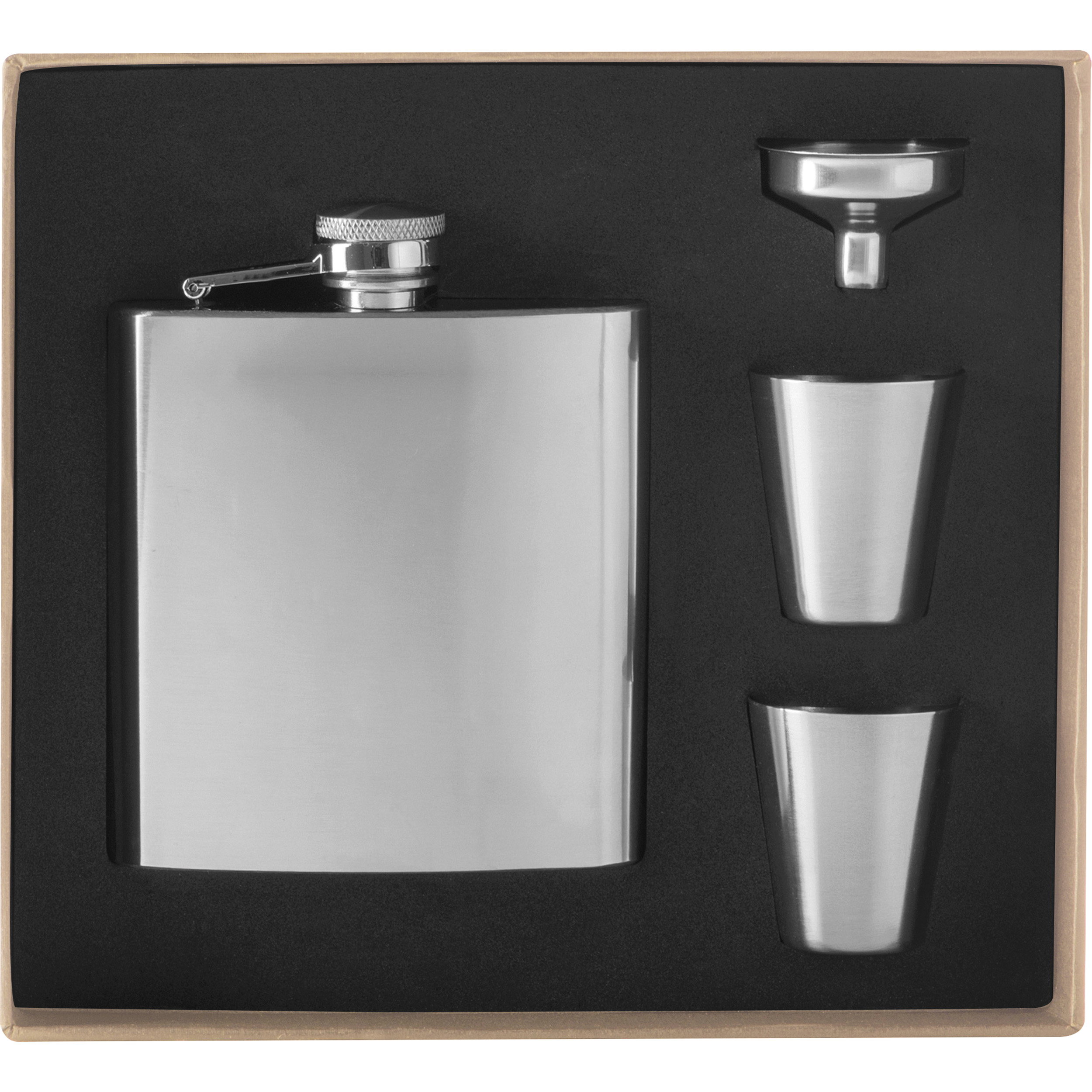 Präsentieren Sie Ihren Kunden ein stilvolles und praktisches Geschenkset - bestehend aus einem Flachmann mit 178 ml Fassungsvermögen, 2 Pinnchen mit je 45 ml Kapazität und einem Edelstahltrichter. Dieses Set ist nicht nur ideal für Getränkeliebhaber, sondern kann auch mit Ihrer individuellen Werbung personalisiert werden.