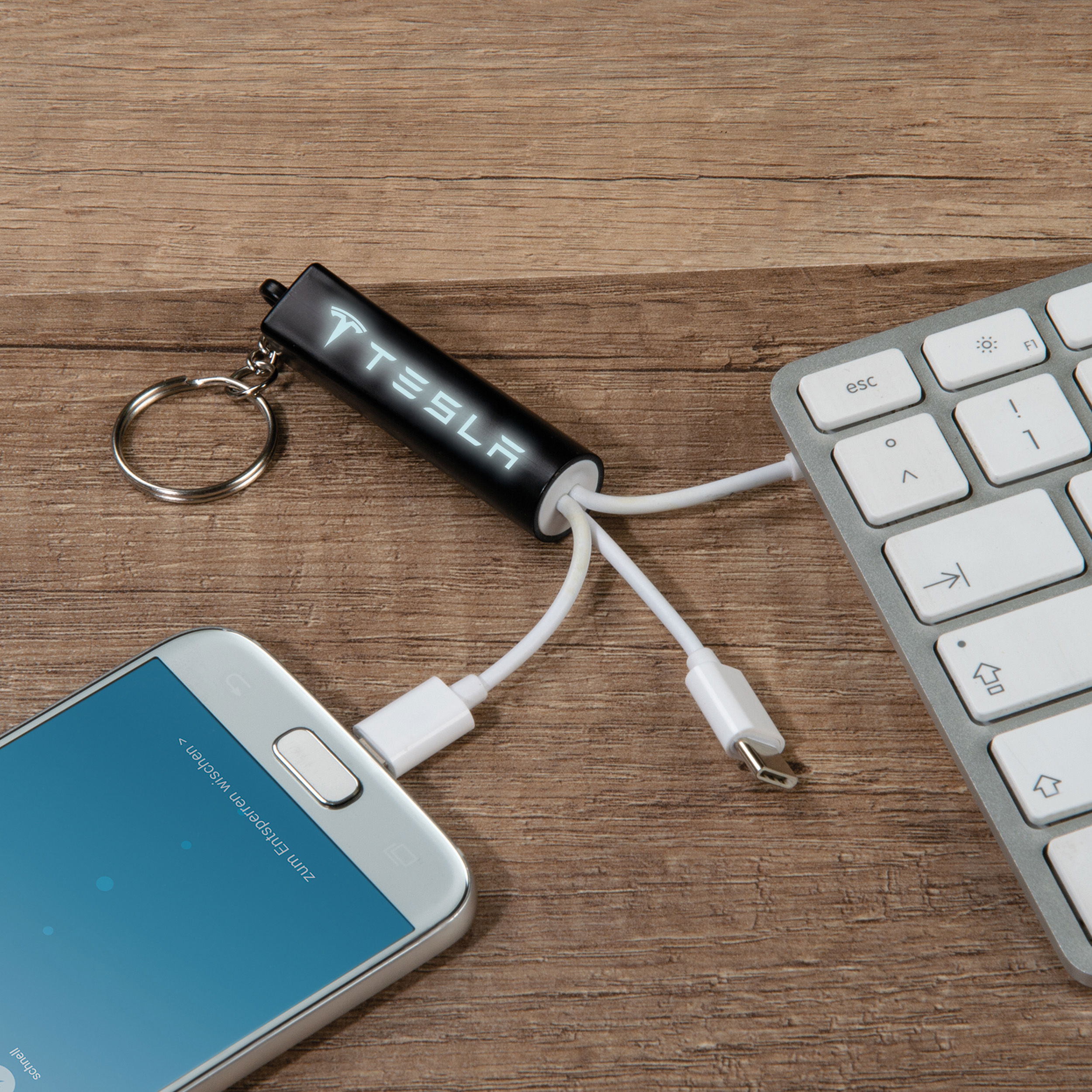 - 3-in-1 Schlüsselanhänger mit USB-, Android- und iOS-Anschluss