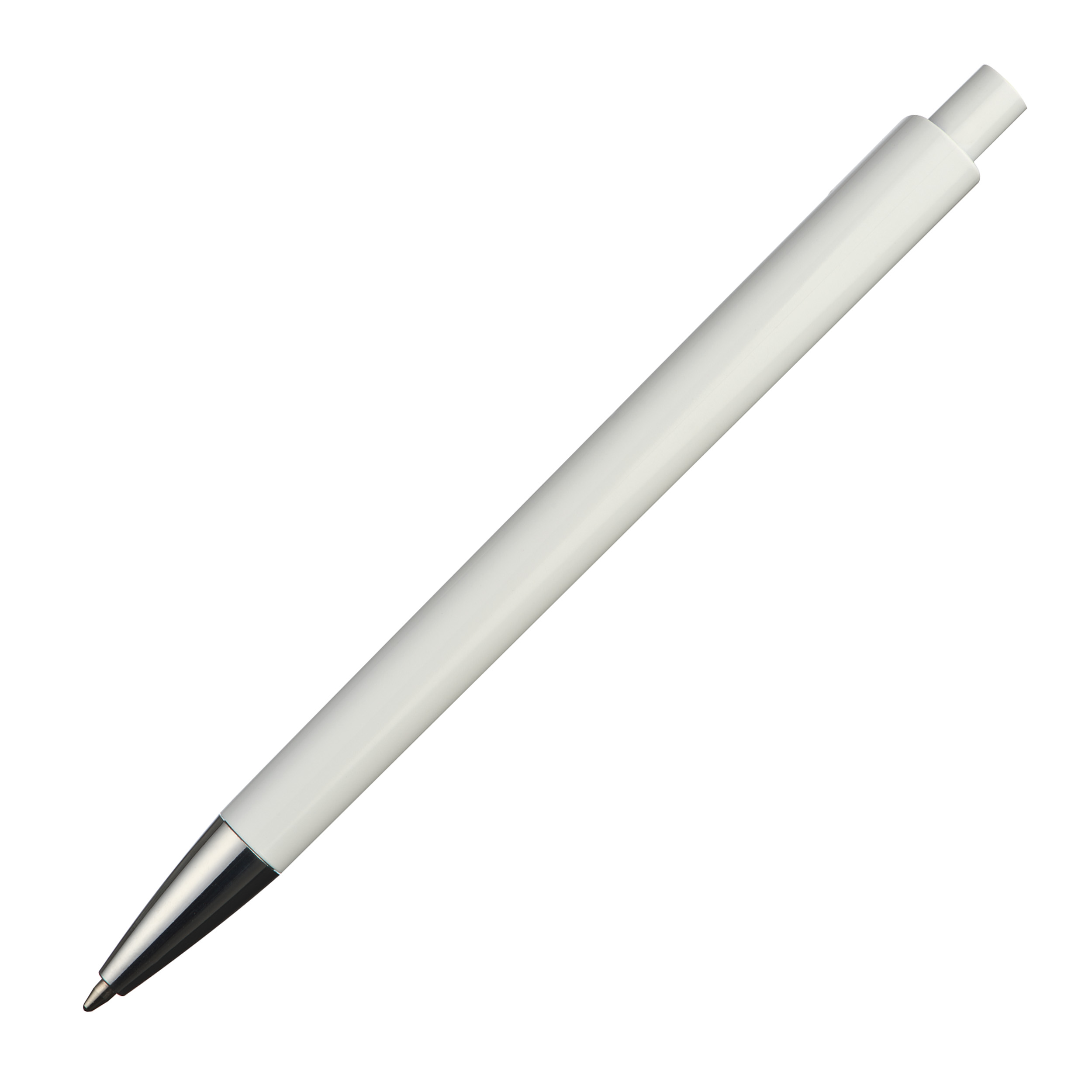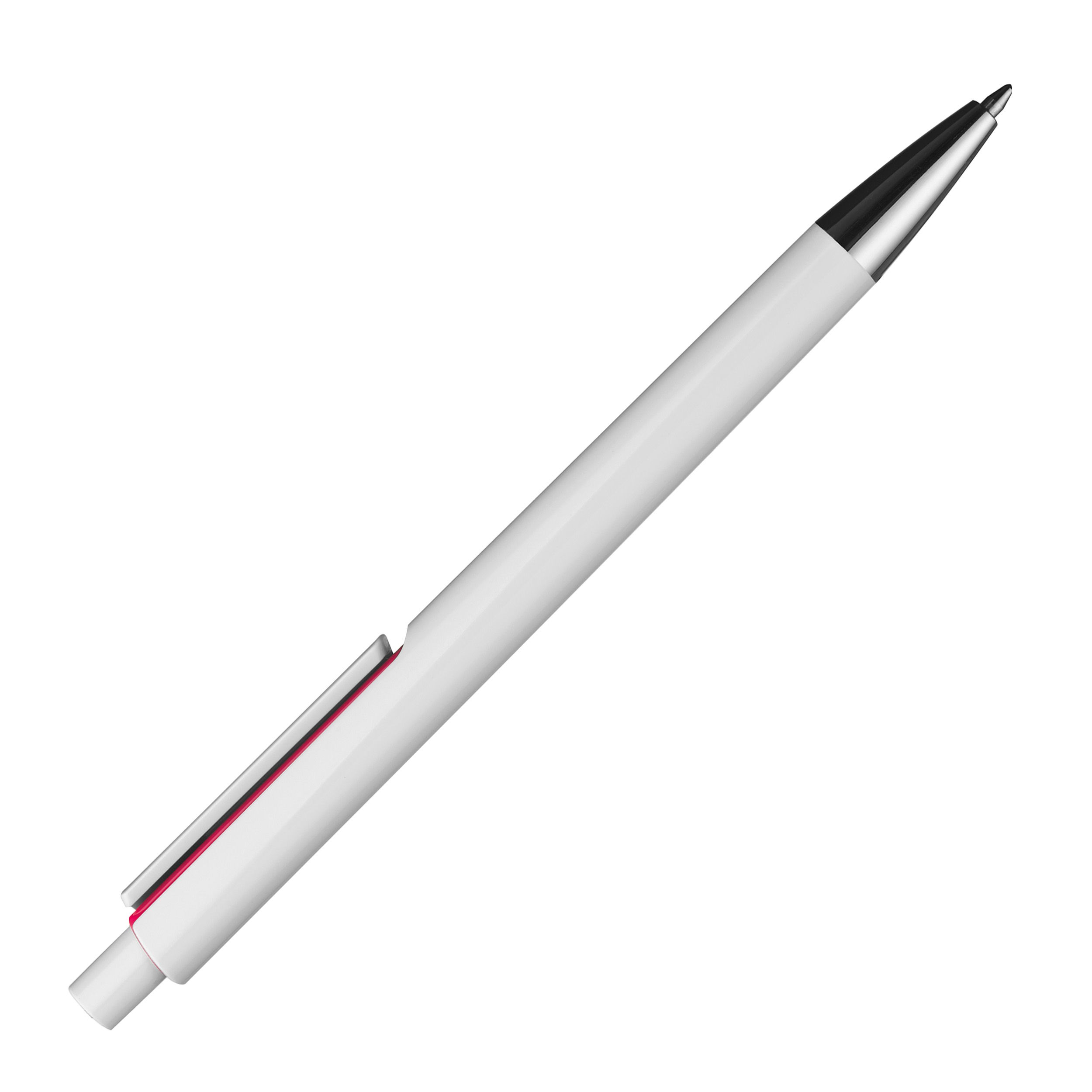 - Ballpoint pen with white barrel and colored accents